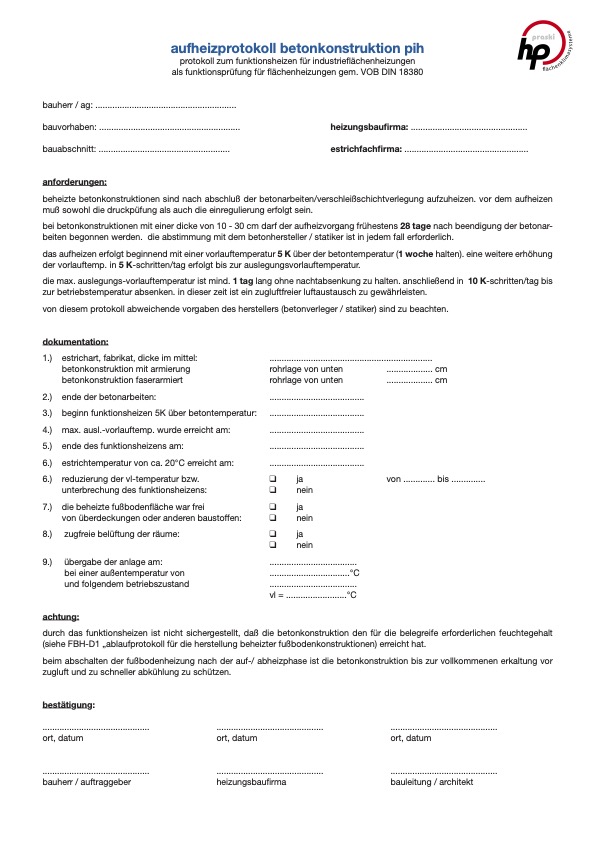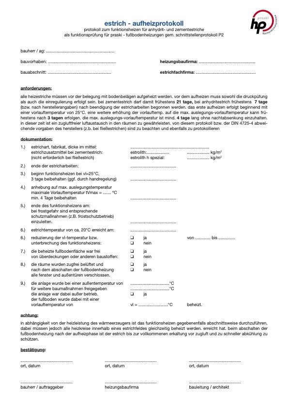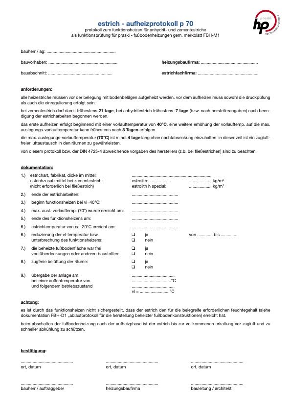 Estrich Aufheizprotokoll P70